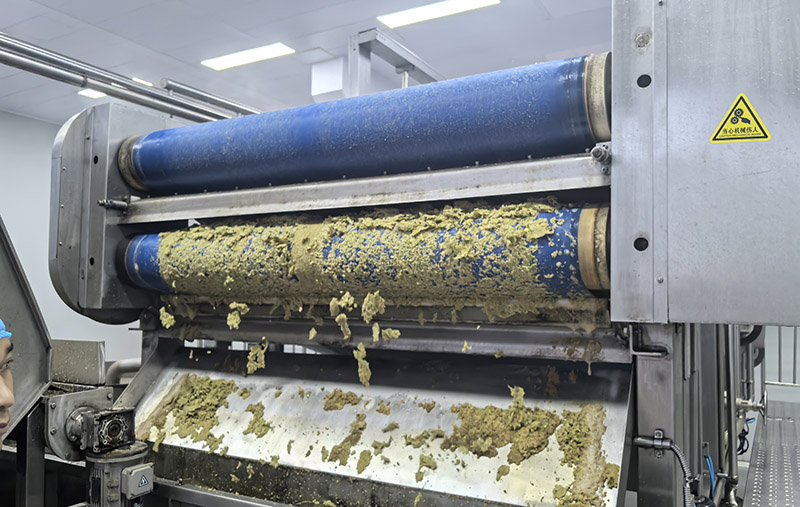 4、压榨和粗滤。常用压榨法和离心分离法榨汁。用孔径0.5毫米的筛网进行粗滤,使不溶性固形物含量下降到20%以下。